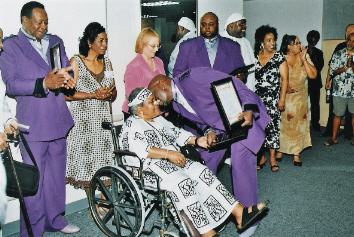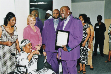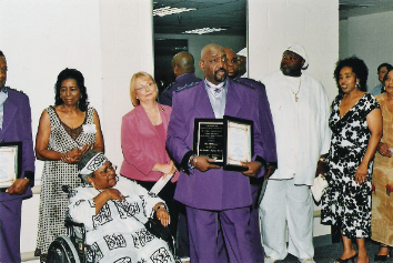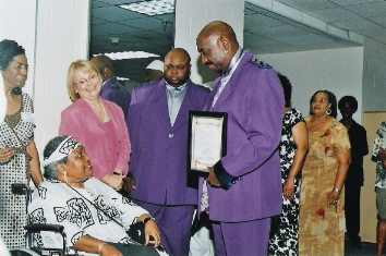 The Temptations founding member, Otis Williams, plants a kiss on the cheek of Dr. Judith Saunders-Burton, great-great-great granddaughter of West Ford, founder of Gum Springs, VA (1833) as he receives "The Antonio Johnson Founder's Legacy Award" as onlookers smile and applaud.