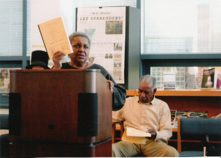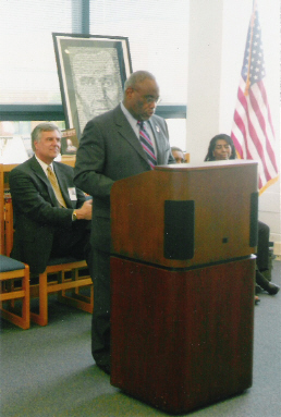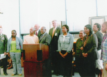 African-American settler of Spring Bank, VA.  In the background are Mayor Bill Euille, Alexandria, VA